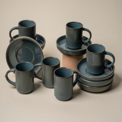 طقم فناجين قهوة سيراميك مخطط مع صحون – 6 قطع - اللون ازرق غامق Striped Ceramic Coffee Cup Set with S